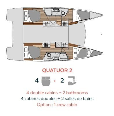| 4 cabines double 1 carre transformable pour 1 couchage double 2 salles de bain |